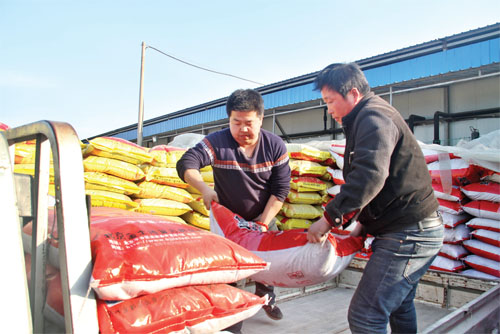 2月29日,原平市農(nóng)業(yè)科技園區(qū)工作人員正在為種子銷售點運送化肥。目前,該市村民積極投入到春耕備耕中,及早動手購化肥、備農(nóng)資,為春耕打好基礎(chǔ)。(褚震 攝)