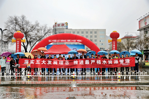 3月22日是第24屆“世界水日”,也是第29屆“中國水周”,市水利局、水資辦、綠色地球協(xié)會冒著瀝瀝小雨聯(lián)合在城區(qū)日月廣場舉行紀(jì)念活動。(馬月林 攝)