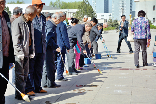 近日,定襄縣委老干局和縣老年書畫研究會(huì)組織該縣50余名書法愛好者在金鼎文化廣場(chǎng)開展了以“匯聚正能量、展示新精神”為主題的社會(huì)主義核心價(jià)值觀地書活動(dòng)?;顒?dòng)旨在倡導(dǎo)和弘揚(yáng)社會(huì)主義核心價(jià)值觀基本內(nèi)容和普及推廣“地書“文化。(張玉虎 攝)