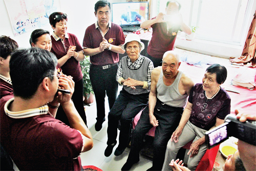 7月2日,原平市新原鄉(xiāng)集中供養(yǎng)敬老院里歌聲飛揚(yáng),原平佳藝藝術(shù)團(tuán)和口琴聯(lián)盟會給這里的老人們送上了一道文化大餐。原平市加強(qiáng)養(yǎng)老服務(wù),在各鄉(xiāng)鎮(zhèn)建設(shè)養(yǎng)老院,使老年人老有所依、老有所養(yǎng),社會團(tuán)體和群眾藝術(shù)團(tuán)經(jīng)常送文化、送藝術(shù)到養(yǎng)老院,豐富了老人們的文化生活。圖為志愿者為老人獻(xiàn)唱。(吉建平 攝)
