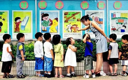 《從小教育》拍于原平市。幼兒園老師在環(huán)保宣傳欄前,教育幼兒園的孩子們從小養(yǎng)成熱愛環(huán)境衛(wèi)生。(楊紅 攝)