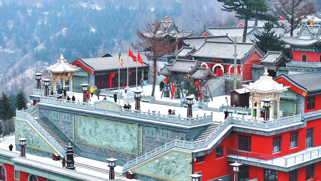 五臺(tái)山的雪,帶著空靈的寧?kù)o。紅墻黛瓦覆上皚皚白雪,似給千年古剎披上素凈袈裟。古松挺立,枝椏掛滿(mǎn)雪凇,晨鐘響起時(shí),雪沫從枝頭簌簌落下,與香火的青煙交織,恍若仙境。