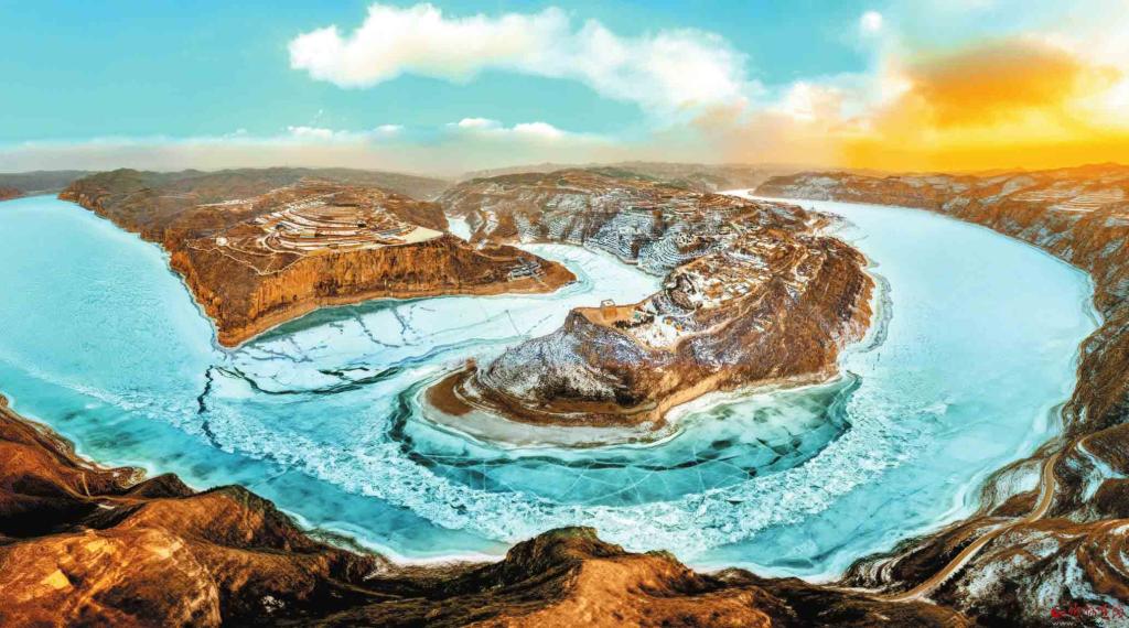 隆冬時(shí)節(jié),偏關(guān)老牛灣被冰雪覆蓋,清晨的霞光讓黃土溝壑與冰面紋理交織出別樣風(fēng)景。(