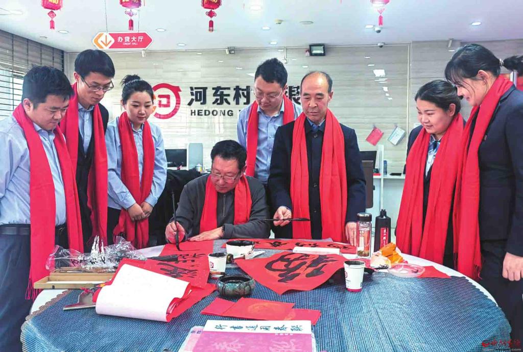 新春到來之際,神池縣河?xùn)|村鎮(zhèn)銀行邀請當(dāng)?shù)貢◥酆谜咴跔I業(yè)大廳現(xiàn)場揮毫潑墨,為前來辦理業(yè)務(wù)的客戶書寫春聯(lián),深受群眾稱贊。(楊晉明攝)