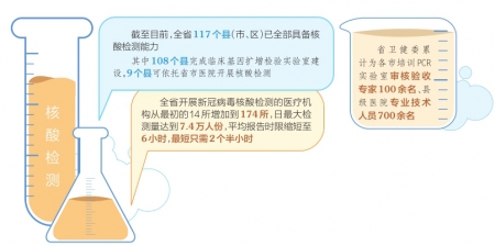 利用核酸檢測開展大范圍篩查,是精準防控疫情的有效手段。省衛(wèi)健委醫(yī)政醫(yī)管局四級調(diào)研員趙宏介紹,全省開展新冠病毒核酸檢測的醫(yī)療機構(gòu)從最初的14所增加到174所,日最大檢測量達到7.4萬人份,平均報告時限縮短至6小時,最短只需2個半小時。