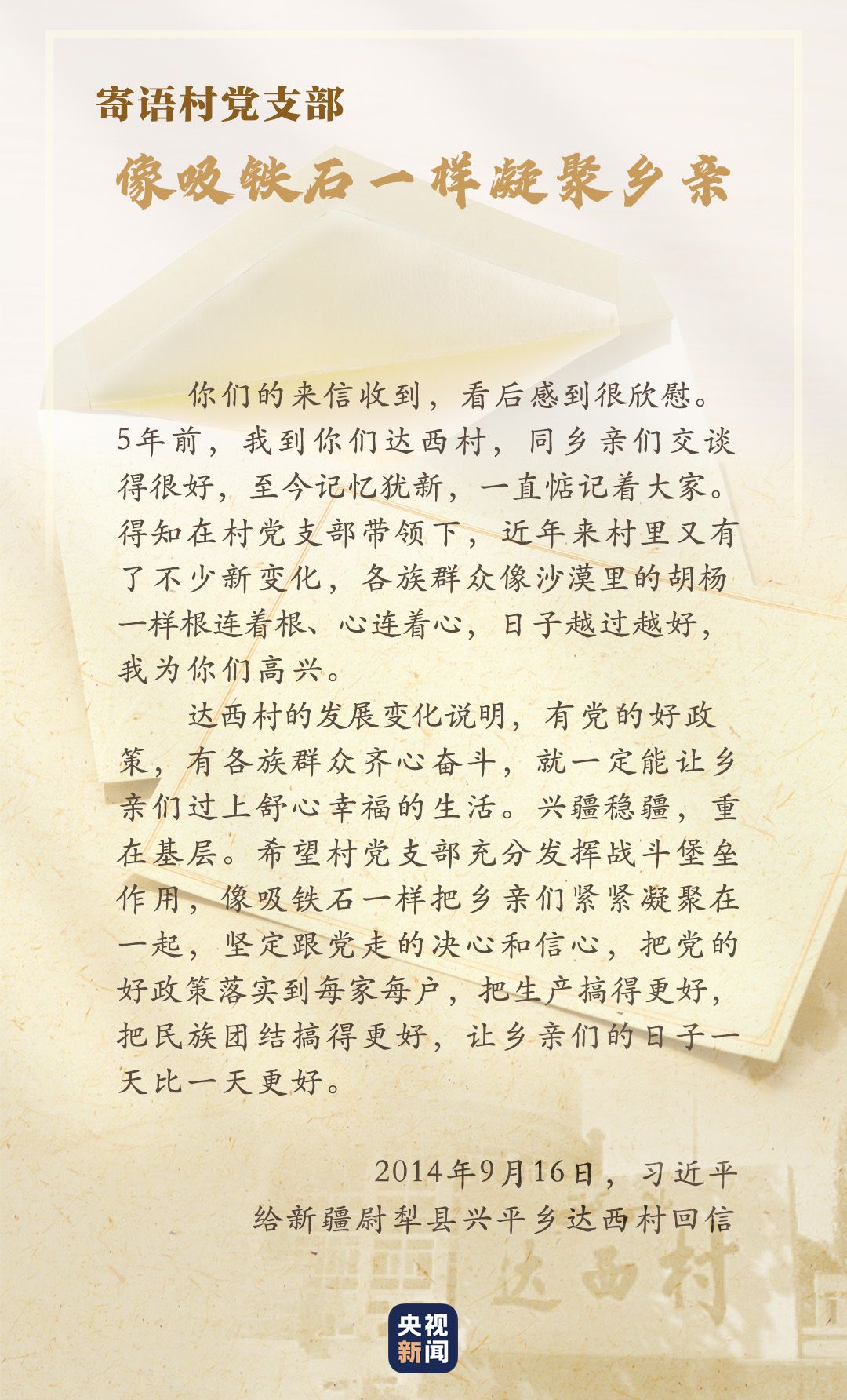 “口袋里要鼓囊囊,精神上要亮堂堂”。2014年4月,習近平在新疆考察時講到了達西村的村訓(xùn)。村民們懷著激動的心情給總書記寫信,匯報這些年村里的積極變化。當年9月,習近平總書記給沙吾爾·芒力克和全體村民回信,強調(diào)興疆穩(wěn)疆,重在基層。
