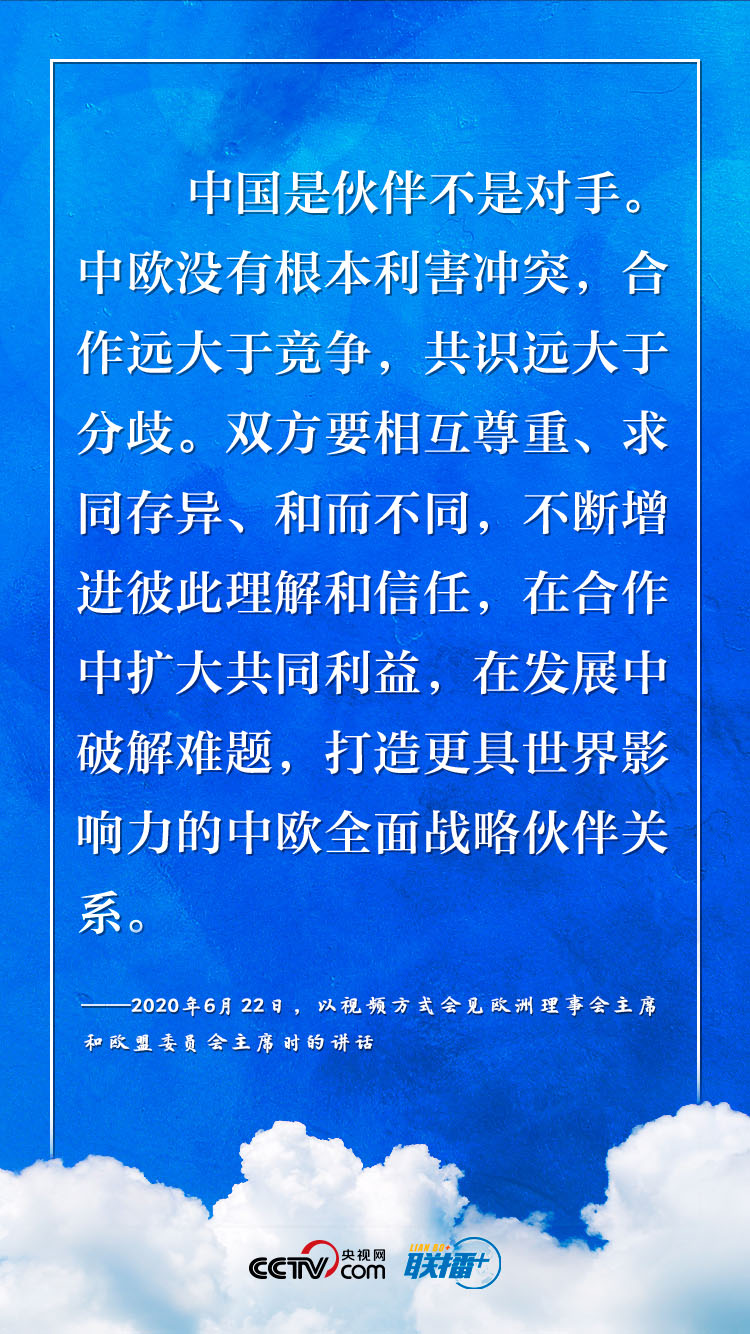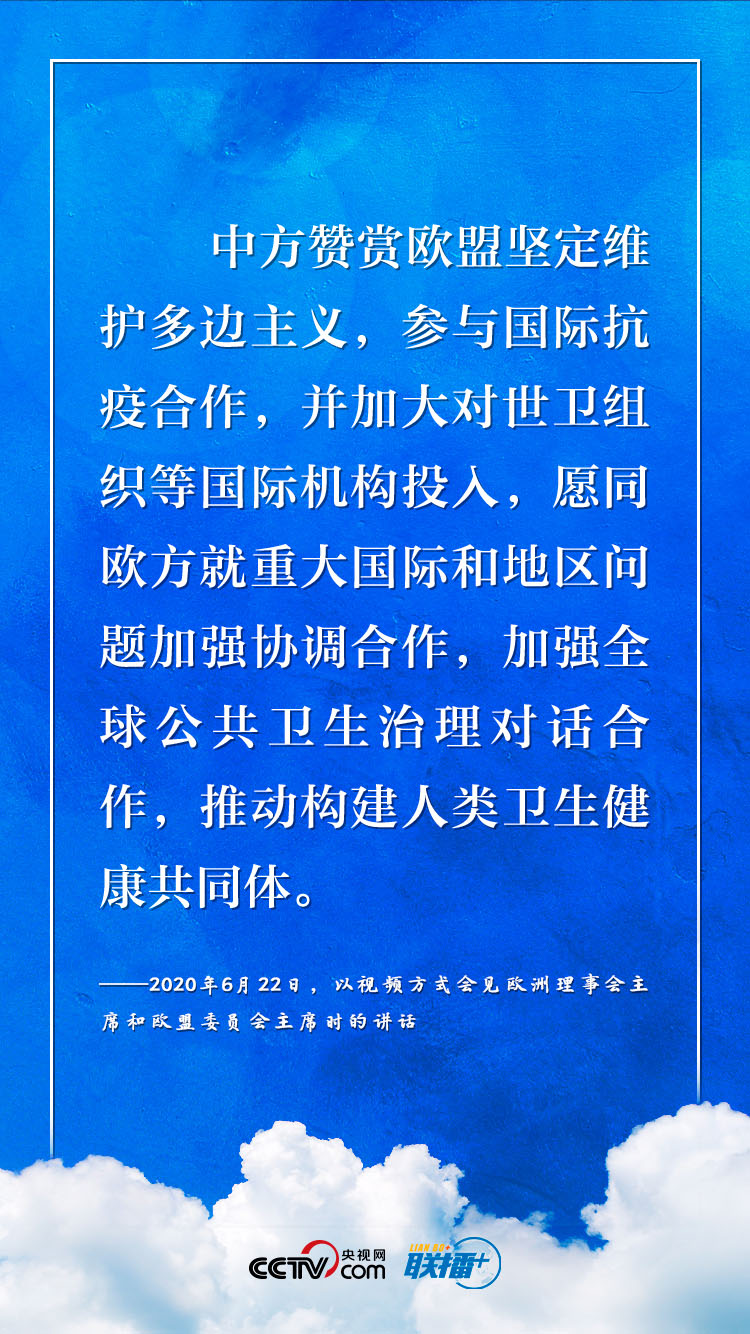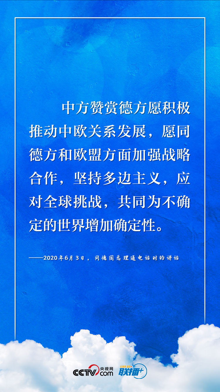 9月14日,習近平主席將以視頻方式同德國總理默克爾、歐洲理事會主席米歇爾、歐盟委員會主席馮德萊恩共同舉行中德歐領(lǐng)導人會晤?!堵?lián)播+》梳理今年以來習近平主席與德國、歐盟領(lǐng)導人“云外交”的部分講話,與您共同感受團結(jié)合作中蘊藏的深遠意義。