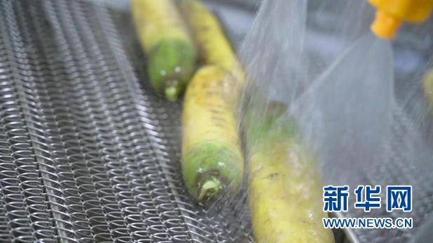 凈菜加工間內(nèi),自動(dòng)化流水線上,正在清洗胡蘿卜。新華網(wǎng)發(fā) (尹杰 攝)