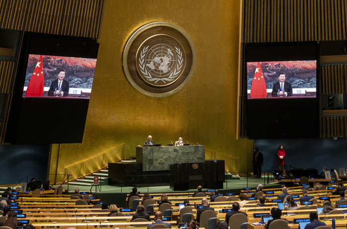 9月22日,國(guó)家主席習(xí)近平在第七十五屆聯(lián)合國(guó)大會(huì)一般性辯論上發(fā)表重要講話。新華社發(fā)(聯(lián)合國(guó)供圖/埃瑟金德?tīng)?middot;德貝貝 攝)