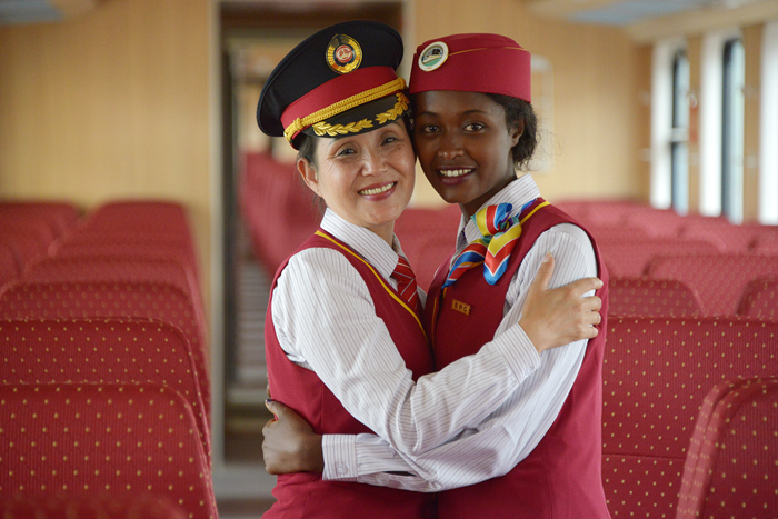 2016年10月1日,在埃塞俄比亞首都亞的斯亞貝巴拉布車站,中方列車長(zhǎng)丁繼華(左)和埃塞俄比亞乘務(wù)員沃克內(nèi)什·貝特魯擁抱。新華社記者孫瑞博攝