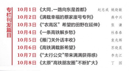 高鐵速度跑出了便捷和美好,并京“同城”夢想成真,成為“速度改變生活”的樣本,京晉經(jīng)濟文化交流更加密切;“蔡家崖號”穿行呂梁山間,為沿線貧困地區(qū)提供著源源不斷的脫貧助力,帶來看得見的變化、穩(wěn)得住的幸福。今年國慶期間,本報開設《坐著火車看山西》專欄,記者踏上火車,體驗生活,假期8天刊發(fā)8篇稿件,展示“十三五”期間我省經(jīng)濟社會發(fā)展的巨大變化。