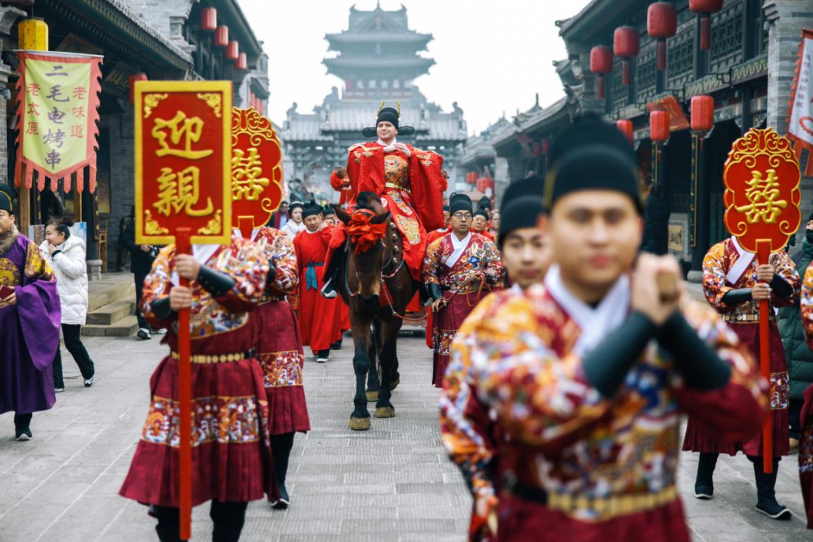 1月4日,在太原古縣城,英國(guó)新郎扎克·威廉森(Zachary Williamson)騎馬迎親,體驗(yàn)中國(guó)傳統(tǒng)文化。 (主辦方提供) 這場(chǎng)婚禮所帶來(lái)的關(guān)注度遠(yuǎn)超兩人預(yù)期。王曌說(shuō):“網(wǎng)友們對(duì)這種真正沉浸式、而非流于表面的復(fù)古婚禮,展現(xiàn)出濃厚的好奇與向往,這讓我十分驚喜?!?/p> 2023年,這對(duì)跨國(guó)夫妻在土耳其伊斯坦布爾舉辦的一次國(guó)際技術(shù)會(huì)議上相識(shí)。然而,身為密碼學(xué)家的威廉森,見(jiàn)面時(shí)卻并未率先談?wù)摴ぷ?,而是與王曌聊起了中國(guó)歷史。令王曌意外的是,威廉森不僅對(duì)中國(guó)古代政治與哲學(xué)頗有研究,更對(duì)中國(guó)歷史與人文有著獨(dú)到的見(jiàn)解。 “在我眼中,他絕非一個(gè)‘技術(shù)宅’,而是一位真正熱愛(ài)歷史的人文主義者。他談吐間流露的博學(xué)、沉穩(wěn)與智慧,深深吸引了我?!蓖鯐渍f(shuō)。 2025年6月,威廉森悄悄飛往美國(guó)加利福尼亞州,在兩人鐘愛(ài)的穆?tīng)柹謬?guó)家紀(jì)念地向王曌求婚。這份突如其來(lái)的驚喜,讓她感動(dòng)落淚。 王曌坦言:“我內(nèi)心有著強(qiáng)烈的文化自豪感,因此希望給自己一場(chǎng)獨(dú)一無(wú)二的婚禮,為家人送上一份充滿儀式感的祝福,也讓英國(guó)的親友們親身體驗(yàn)地道的中國(guó)文化?!?/p> 這場(chǎng)婚禮深度融合了晉南民俗風(fēng)情、太原本土文化與明代婚嫁禮儀的精髓。擁有20年婚慶行業(yè)從業(yè)經(jīng)驗(yàn)的資深策劃師趙燕明,全程統(tǒng)籌了這場(chǎng)婚禮。 他表示:“這不僅是一場(chǎng)婚禮,更是一次跨文化交流。能參與其中,我深感榮幸。希望這場(chǎng)婚禮能增進(jìn)中英兩國(guó)人民之間的文化交流,讓更多外國(guó)友人領(lǐng)略中式傳統(tǒng)婚禮的獨(dú)特魅力?!?/p>
