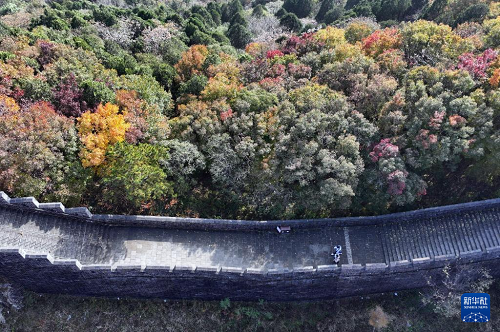 10月28日拍攝的天津市薊州區(qū)黃崖關(guān)長(zhǎng)城秋景(無(wú)人機(jī)照片)。(新華社記者 李然 攝)