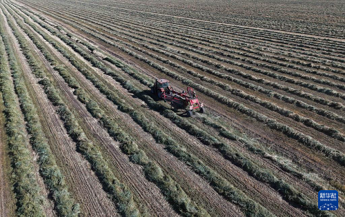 11月1日,工人駕駛拖拉機(jī)在甘肅山丹馬場(chǎng)二場(chǎng)田間翻曬燕麥草(無人機(jī)照片)。(新華社發(fā) 陳禮 攝)