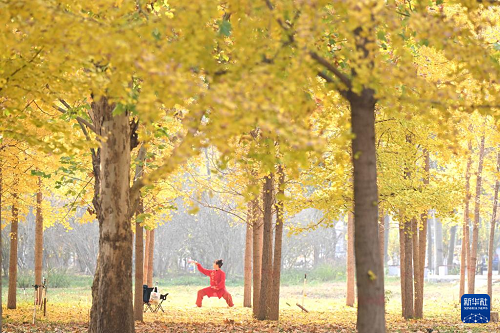 11月4日,市民在石家莊市的河北經(jīng)貿大學的銀杏林下晨練。(新華社發(fā) 陳其保 攝)