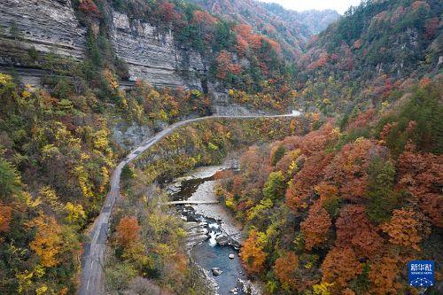 漢中市南鄭區(qū)境內(nèi)的黎坪國家森林公園秋色(11月5日攝,無人機照片)。(新華社記者 邵瑞 攝)