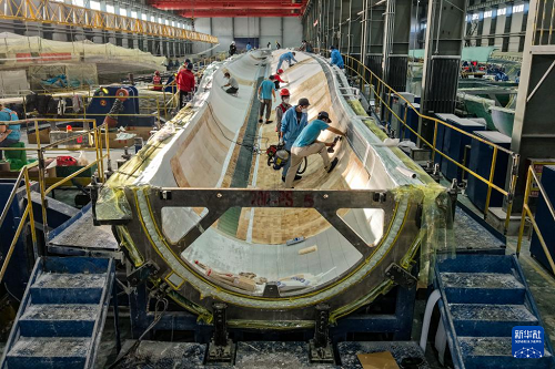 11月20日,在甘肅省酒泉經(jīng)濟(jì)技術(shù)開發(fā)區(qū)的甘肅九鼎風(fēng)電復(fù)合材料有限公司成型車間,工作人員進(jìn)行風(fēng)機(jī)葉片鋪層作業(yè)(無人機(jī)照片)。(新華社記者 郎兵兵 攝)