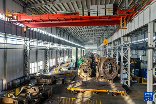 11月20日,在甘肅省酒泉經(jīng)濟(jì)技術(shù)開發(fā)區(qū)的日月重工(甘肅)有限公司機(jī)加車間,工作人員操作起重機(jī)轉(zhuǎn)運(yùn)風(fēng)機(jī)輪轂(無人機(jī)照片)。(新華社記者 郎兵兵 攝)