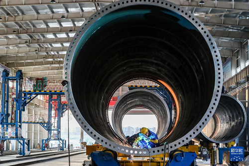 11月20日,在甘肅省酒泉經(jīng)濟(jì)技術(shù)開發(fā)區(qū)的中國水電四局(酒泉)新能源裝備有限公司塔筒制造車間,工作人員進(jìn)行風(fēng)機(jī)塔筒焊接作業(yè)。(新華社記者 郎兵兵 攝)