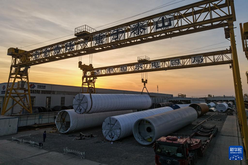 11月20日,在甘肅省酒泉經(jīng)濟(jì)技術(shù)開發(fā)區(qū)的中國水電四局(酒泉)新能源裝備有限公司裝運(yùn)生產(chǎn)線上,工作人員進(jìn)行風(fēng)機(jī)塔筒吊裝作業(yè)(無人機(jī)照片)。(新華社記者 郎兵兵 攝)