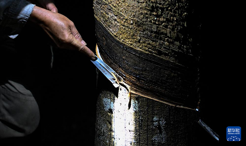 海南省白沙黎族自治縣牙叉鎮(zhèn)新高峰村的膠農(nóng)在割膠(11月19日攝)。(新華社記者 楊冠宇 攝)