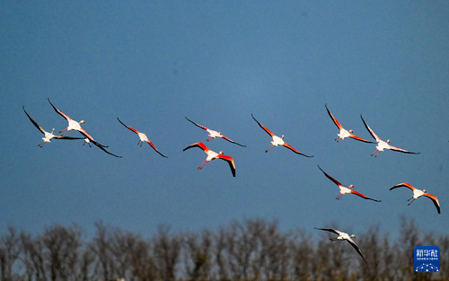 12月8日,火烈鳥在江蘇東臺(tái)條子泥濕地飛翔。(新華社發(fā) 孫家錄 攝)