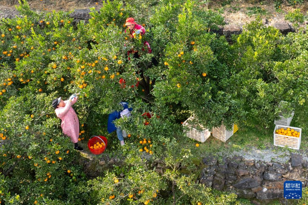 12月11日,在湖北省宜昌市長(zhǎng)陽土家族自治縣漁峽口鎮(zhèn)巖松坪村,村民在采摘清江椪柑(無人機(jī)照片)。(新華社記者 杜子璇 攝)