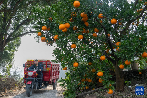 12月11日,在湖北省宜昌市長(zhǎng)陽土家族自治縣漁峽口鎮(zhèn)巖松坪村,村民在轉(zhuǎn)運(yùn)剛采摘的清江椪柑。(新華社記者 杜子璇 攝)