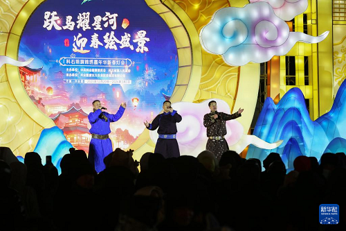 12月20日,當(dāng)?shù)貫跆m牧騎演員在燈會(huì)上表演。新華社發(fā)