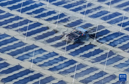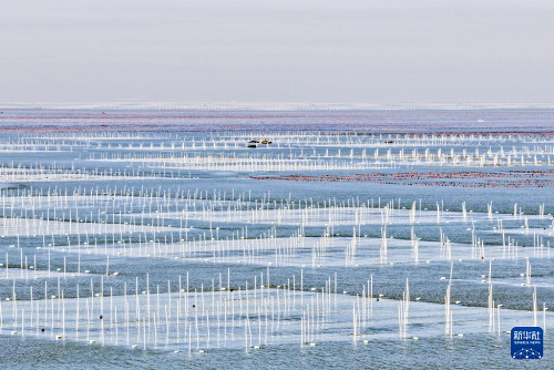 1月8日,漁民在江蘇連云港市海州灣漁場養(yǎng)殖區(qū)收獲條斑紫菜(無人機照片)。(新華社發(fā) 王健民 攝)