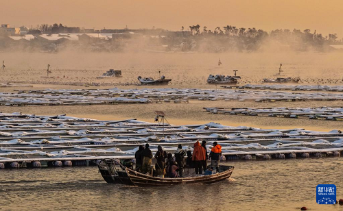 1月12日,雪后的山東省榮成市愛倫灣海洋牧場出現(xiàn)“海浩”景觀。據(jù)悉,“海浩”景觀是一種在嚴寒天氣下出現(xiàn)的自然奇觀,表現(xiàn)為海面或湖面上水汽蒸發(fā)后遇冷凝結(jié),形成白茫茫的霧氣,如同水面沸騰一般。