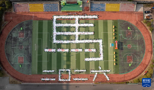 這是榮縣樹人小學(xué)校操場上的巨型“馬”字畫布(1月14日攝,無人機照片)。(新華社發(fā) 何海洋 攝)