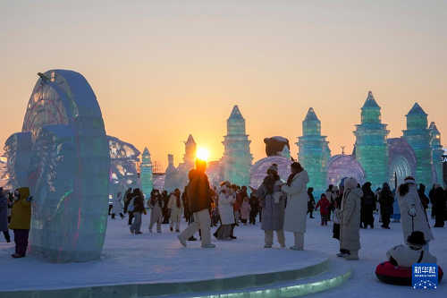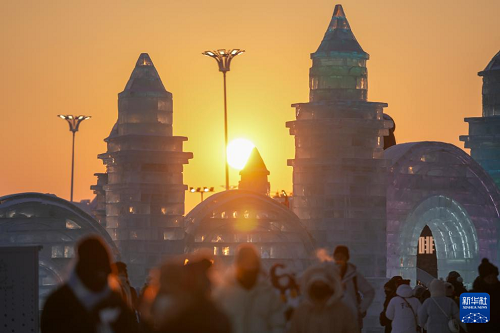 夕陽(yáng)西下,落日余暉為哈爾濱冰雪大世界披上暖金霞光,游客盡享冬日的浪漫與溫柔。