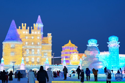 這是1月27日拍攝的哈爾濱冰雪大世界園區(qū)內(nèi)的冰雪景觀。(新華社記者 王松 攝)