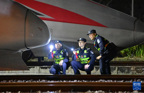 2月2日凌晨,南寧鐵路公安局南寧公安處長(zhǎng)崗嶺站派出所民警在南寧動(dòng)車(chē)所檢查列車(chē)安全情況。(新華社記者 陸波岸 攝)