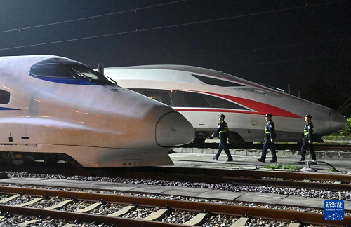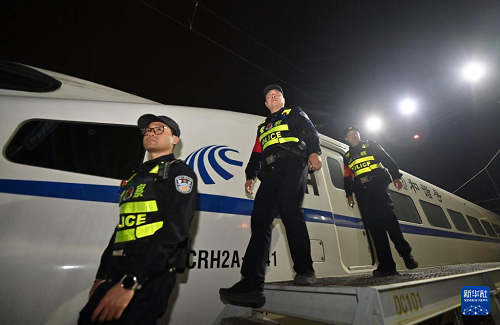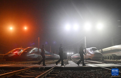 2月2日凌晨,南寧鐵路公安局南寧公安處長(zhǎng)崗嶺站派出所民警在南寧動(dòng)車(chē)所巡邏。(新華社記者 陸波岸 攝)