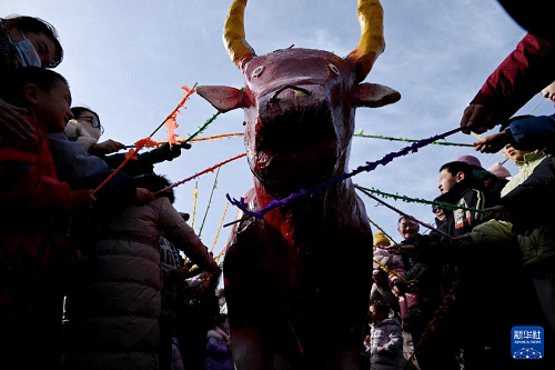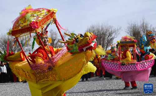 2月4日,人們?cè)诟拭C省敦煌市白馬塔景區(qū)“打春?!薄#ㄐ氯A社發(fā) 張曉亮 攝)
