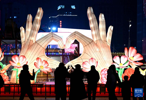 2月11日,市民在甘肅省定西市安定區(qū)新時(shí)代廣場(chǎng)觀賞傳統(tǒng)手工花燈展覽。(新華社發(fā) 陳永剛 攝)