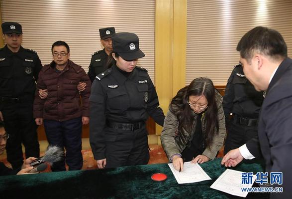 2月6日,在北京首都機(jī)場(chǎng),檢察官向“百名紅通”嫌犯付耀波(右五)、張清曌(右二)宣讀相關(guān)法律文書(shū)。當(dāng)日,在中央追逃辦統(tǒng)一部署下,在外交部、公安部及我駐巴巴多斯、格林納達(dá)等駐外使館的大力協(xié)助下,遼寧省追逃辦組織協(xié)調(diào)檢察、公安等部門(mén),成功將遠(yuǎn)逃至加勒比海島國(guó)圣文森特和格林納丁斯的“百名紅通”第39號(hào)嫌犯付耀波、第41號(hào)嫌犯張清曌同時(shí)抓獲歸案。新華社記者殷剛攝