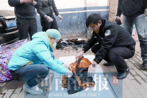 民警在被害人衣物上找線索。河南商報(bào)記者 王春勝/攝