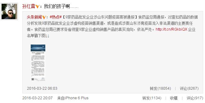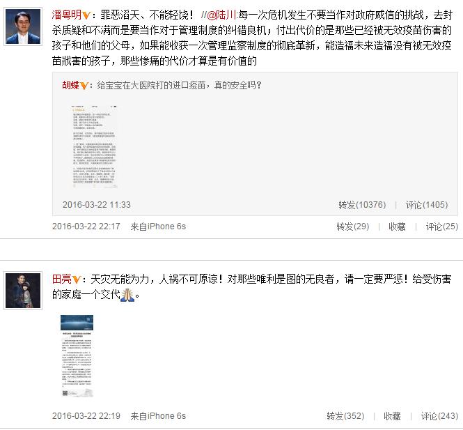 繼章子怡、賈乃亮等人在微博發(fā)聲關(guān)注疫苗安全問題后,3月22日晚,孫紅雷也在微博心痛呼叫“我的孩子……”任賢齊在微博中寫道:“請重視并嚴(yán)懲無良商人!別讓這些混蛋荼毒孩子們的健康!”舒淇、趙薇也排隊轉(zhuǎn)發(fā)并利用自身名人效應(yīng)呼吁。