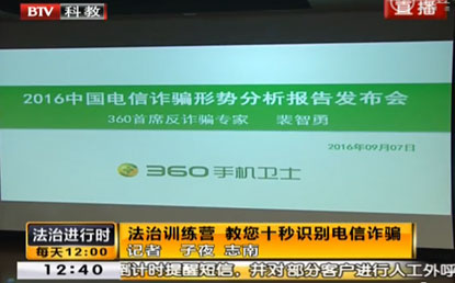 中國(guó)經(jīng)濟(jì)網(wǎng)北京9月12訊 生活中,當(dāng)你接到詐騙電話的時(shí)候,你要多久能發(fā)現(xiàn)這個(gè)騙局呢,10秒?20秒?還是根本識(shí)別不出來(lái)?9月10日,北京衛(wèi)視《法治進(jìn)行時(shí)》欄目在節(jié)目一開(kāi)始便拋出了這樣一個(gè)問(wèn)題。面對(duì)電信詐騙分子日益多變的手法,如何頭腦清晰地最快識(shí)別出騙局?這一期的《法治進(jìn)行時(shí)》和360手機(jī)衛(wèi)士專(zhuān)家一起給大家提供了很多實(shí)用的建議。
