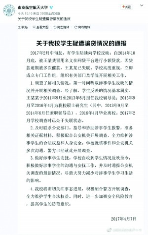 在4月7日下午,“@南京航空航天大學”官微發(fā)布了“關(guān)于我校學生疑遭騙貸情況的通報”,通報稱,從2017年2月中旬起,有學生陸續(xù)向?qū)W校反映,自2014年10月底,被王某冒用名義在網(wǎng)貸平臺進行小額貸款,因貸款逾期被多次催款,王某已失聯(lián)。學校高度重視,立即成立專門工作組,組織有關(guān)部門及學院開展相關(guān)工作。經(jīng)調(diào)查了解,學生反映的情況基本屬實。