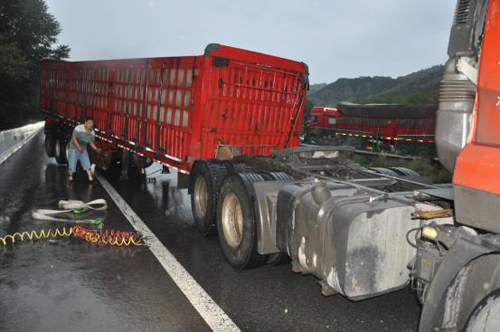 2017年08月26日19時00分許,高速二支隊九大隊民警翟躍、郭騏源接到報警稱:在五保高速8km處,有一輛紅色東風牌重型半掛貨車因出車前未檢查車輛,駕駛存在安全隱患的車輛上路行駛,將掛車脫落,后與中央護欄發(fā)生碰撞,造成車輛及路產(chǎn)不同程度損壞的道路交通事故。大隊民警第一時間趕赴現(xiàn)場,只有超車道可以通行,在做好安全防護的情況下,及時詢問當事人是否受傷,是否需要撥打“120”急救,并了解了當時的事發(fā)情況。當事人稱:“自己一個人開車去陜西拉煤,走的時候著急,沒檢查車輛,在行駛過程中,就感覺車輛掛車在擺動,因為是雨天,也沒在意,行駛到8km處時,踩剎車過急,加之路面濕滑,掛車突然脫落與中央護欄發(fā)生碰撞,所幸人沒有受傷?!敝?,民警對現(xiàn)場進行勘查,并調取監(jiān)控視頻,發(fā)現(xiàn)車輛在剎車時,車速較快,駕駛員駕駛存在安全隱患的車輛是造成事故發(fā)生的原因。