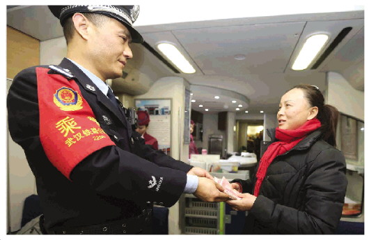 圖為武漢鐵路公安局武漢公安處乘務(wù)二大隊(duì)乘警魏國強(qiáng)(左)將找到的遺失錢財(cái)交給失主。趙軍 攝