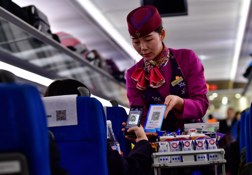 圖為在重慶客運(yùn)段G8516次列車上,一名旅客在使用手機(jī)掃碼支付購買飲用水。新華社記者 劉潺 攝