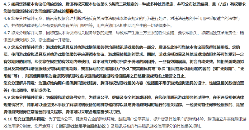 所有網(wǎng)游初次進入游戲都會看到一份密密麻麻的游戲服務協(xié)議,用戶不同意則不能享受游戲內(nèi)容,包括騰訊在內(nèi)運營商為什么都這么做?因為國家規(guī)定。根據(jù)《網(wǎng)絡安全法》《互聯(lián)網(wǎng)信息服務管理辦法》《互聯(lián)網(wǎng)用戶賬號信息管理規(guī)定》,互聯(lián)網(wǎng)信息服務提供者應當依照法律法規(guī)有關(guān)規(guī)定,制定和公開互聯(lián)網(wǎng)用戶賬號管理規(guī)則、平臺公約,與用戶簽訂服務協(xié)議,明確賬號信息注冊、使用和管理相關(guān)權(quán)利義務。玩家使用賬號如果違反法律法規(guī)、用戶協(xié)議的,互聯(lián)網(wǎng)信息服務提供者有權(quán)采取警示提醒、限期改正、限制賬號功能、暫停使用、關(guān)閉賬號、禁止重新注冊等處置措施。
