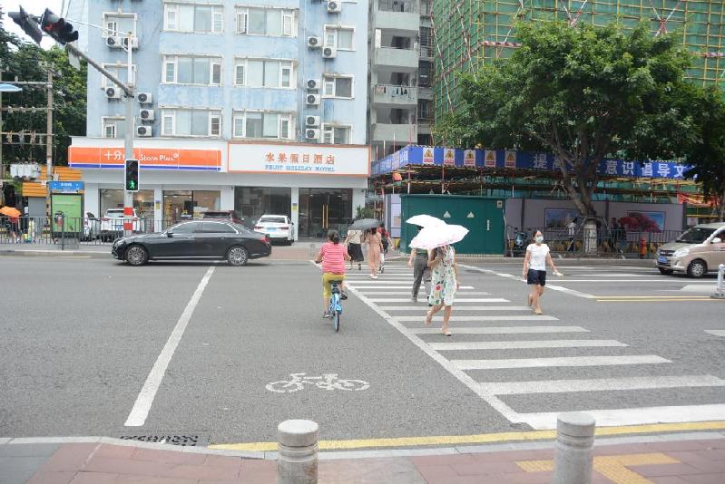 圖為8月1日記者拍攝的廈門(mén)體育路與育秀東路交叉口的非機(jī)動(dòng)車(chē)與行人分流的斑馬線。新華社記者顏之宏 攝