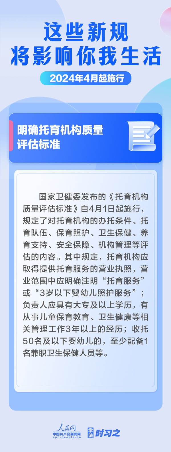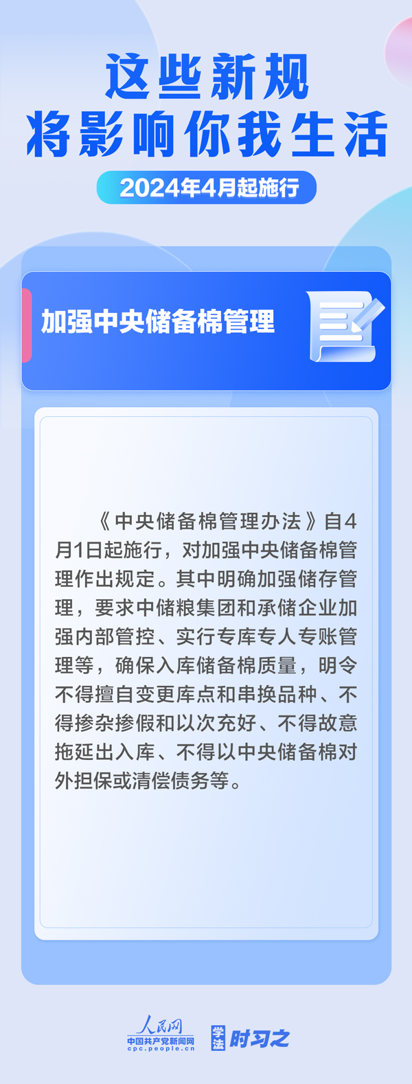 加強中央儲備棉管理;明確托育機構(gòu)質(zhì)量評估標準;規(guī)范可再生能源電量收購……4月起,這些新規(guī)施行,將影響你我生活。(薄晨棣)