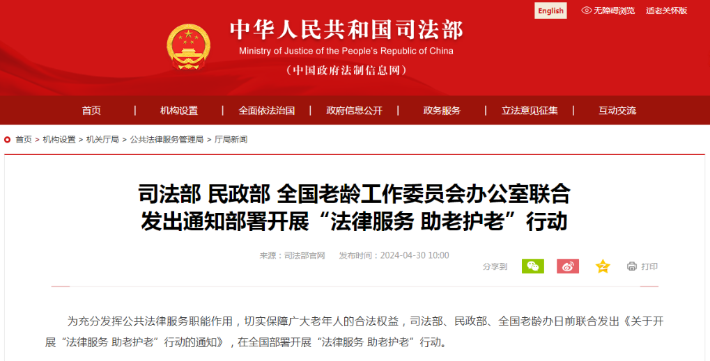 司法部、民政部、全國老齡辦日前聯(lián)合發(fā)出《關(guān)于開展“法律服務(wù) 助老護老”行動的通知》,在全國部署開展“法律服務(wù) 助老護老”行動。行動聚焦老年人群體公共法律服務(wù)需求,推出6個方面措施。